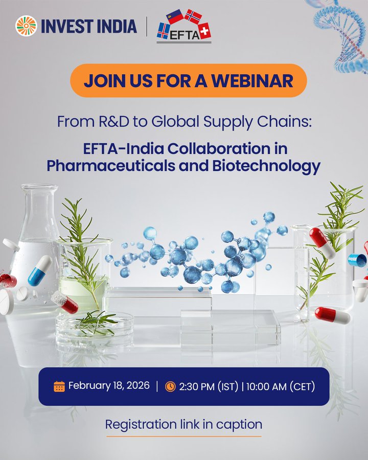 EFTA og Invest India efna til netmálþings (webinar) um samstarfstækifæri fyrirtækja á Indlandi og í EFTA-ríkjunum á lyfja- og líftæknimarkaði. Málþingið verður haldið miðvikudaginn 18. október kl. 9-10 að íslenskum tíma. Fjallað verður um allt frá rannsóknum og þróun til alþjóðlegra aðfangakeðja í þessum geirum. Íslenskum fyrirtækjum er velkomið að skrá sig á hlekknum hér að neðan.